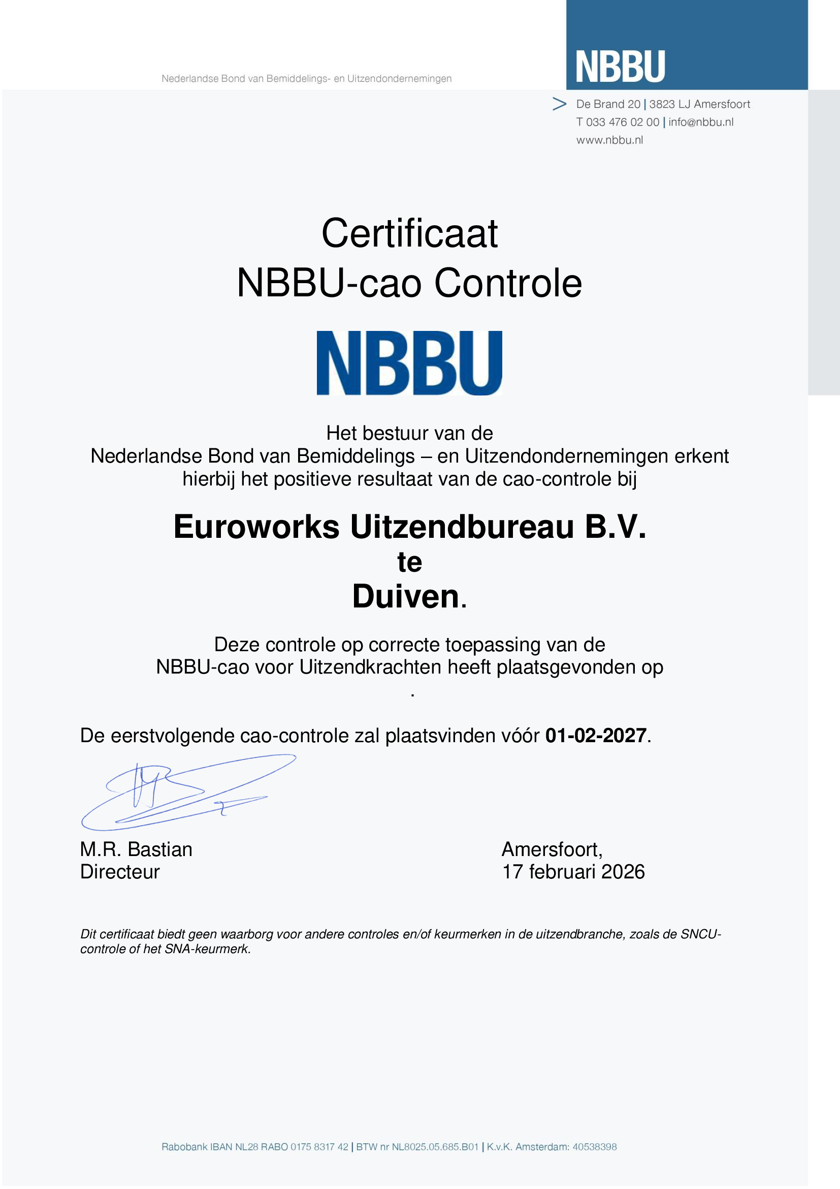 Bij Euroworks Uitzendbureau staat zekerheid voorop. Als trots lid van de NBBU (Nederlandse Bond van Bemiddelings- en Uitzendondernemingen) garanderen wij onze opdrachtgevers en werknemers de hoogste kwaliteitsstandaarden.